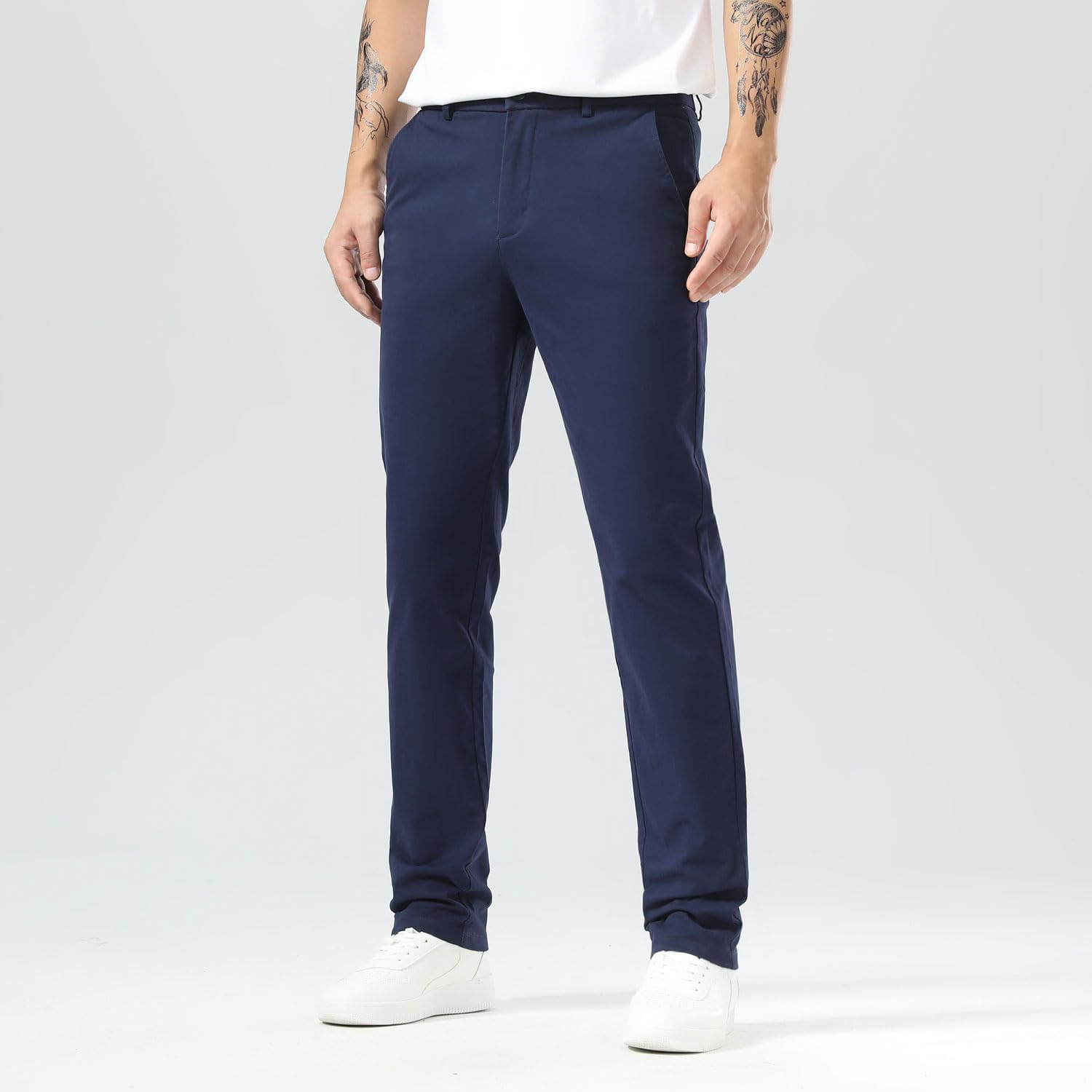 - Slim fit pants for men who want a more updated, slightly below the waist, slim through the thigh, tapered leg opening measures 6.89″ flat taken from size 33W. The men’s khakis pants provide a versatile base for smart-casual looks.