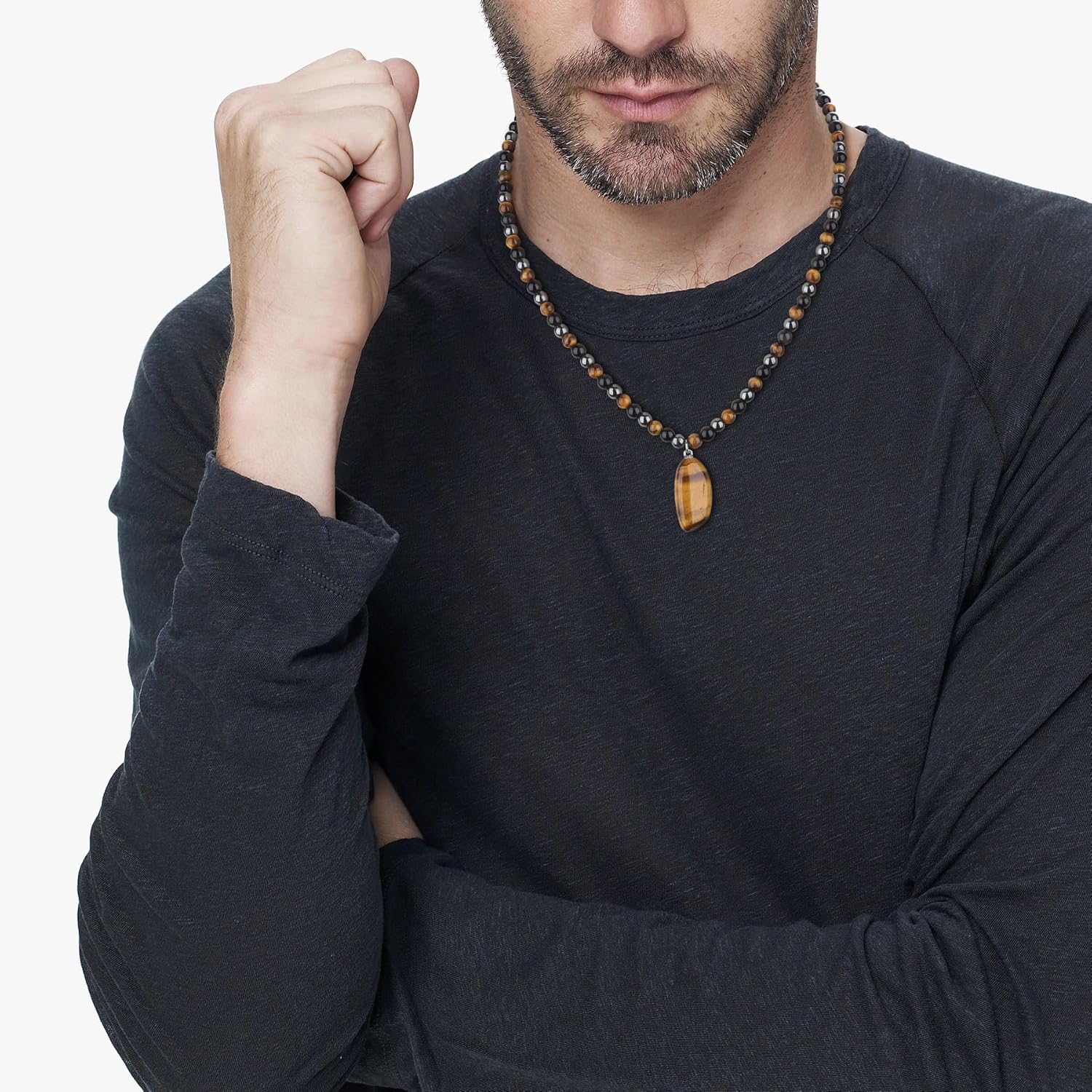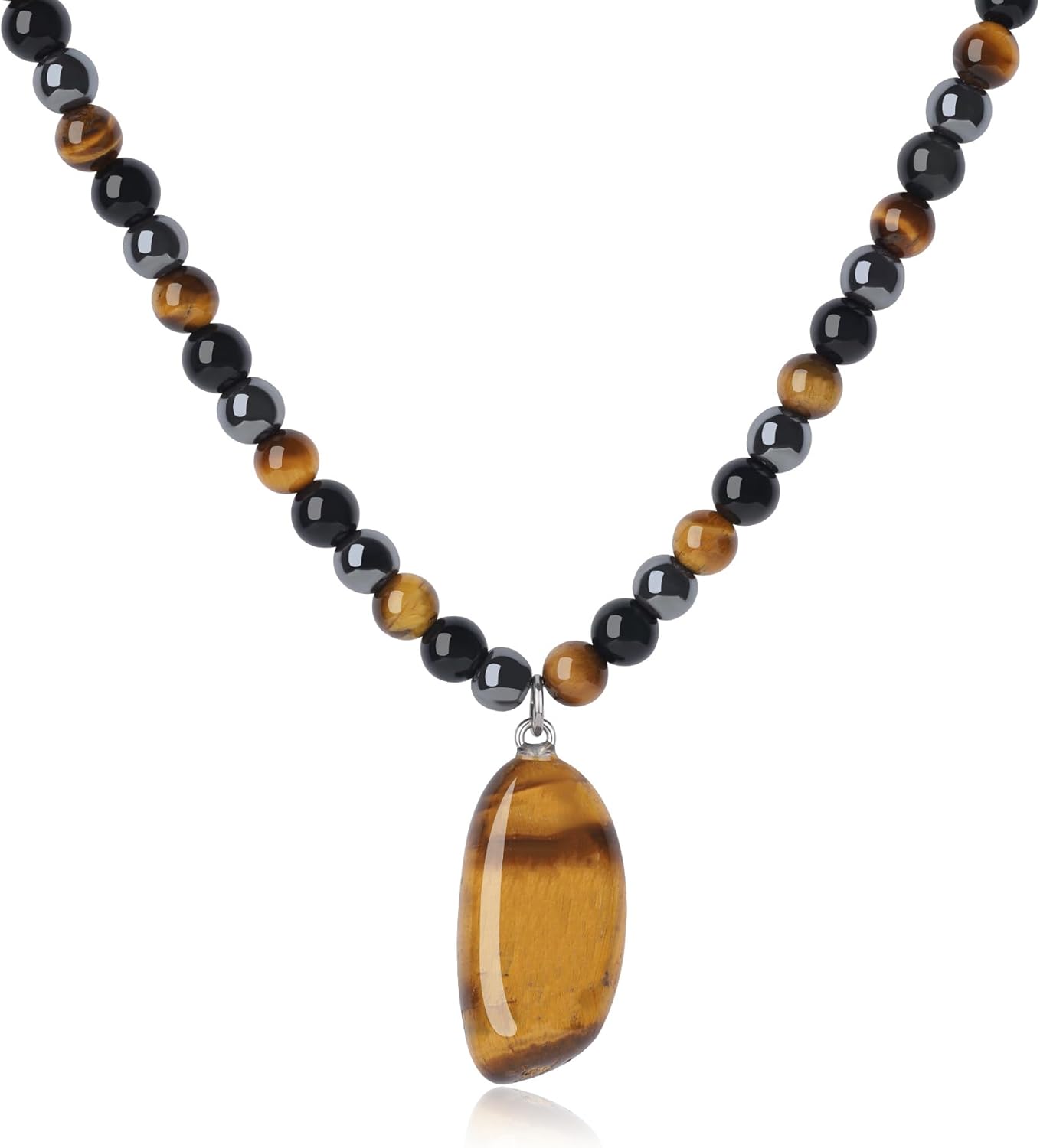 - Triple Protection Necklace: This crystal necklace for men features a 1.2”(3cm) tiger eye pendant in irregular shape with 6mm black obsidian, hematite and tiger eye beads; Each pendant may vary slightly in size